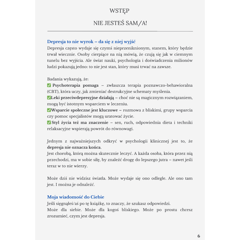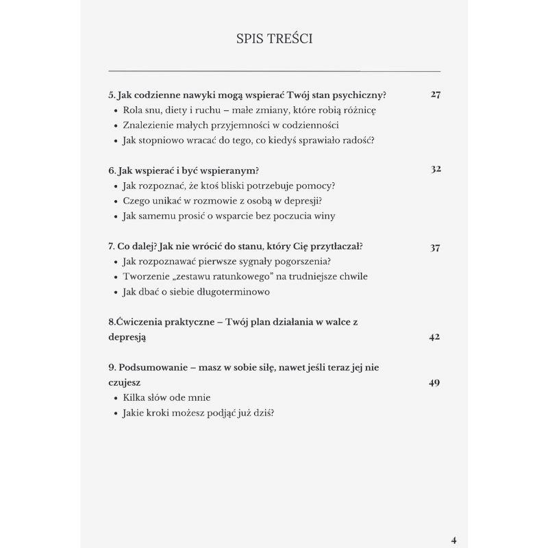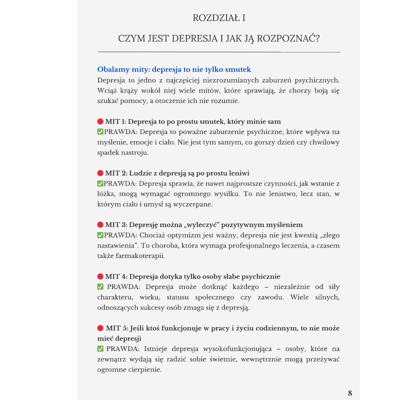 Podoba mi się, że autor nie ocenia, nie używa skomplikowanych słow, tylko pisze normalnie, jak do człowieka. Dzieki temu łatwo było mi zrozumieć, czym różni się depresja od zwykłego zmęczenia. Brakuje nam w społeczeństwie właśnie takiego podejści, żeby depresji nie stygmatyzować, tylko uczyć się o niej mówić otwarcie i z empatią.