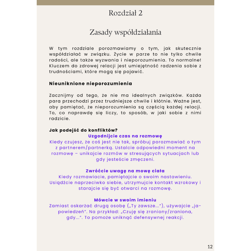 E-book skupia się głównie na rozmowach i emocjach, a za mało na konkretnych rozwiązaniach typu „co zrobić krok po kroku”. Brakuje jednoznacznych instrukcji, które pasowałyby do każdej relacji.