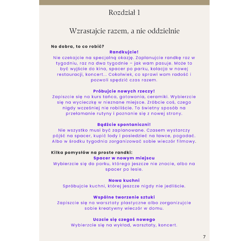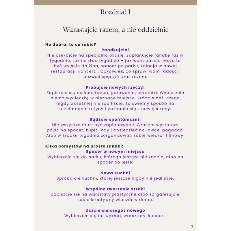 Kupiłam ten e-book, bo miałam wrażenie, że w naszym związku wszystko kręci się wokół pracy, domu i obowiązków. Miłość była, ale rozmów coraz mniej. Dzięki tej książce zobaczyłam, jak małe rzeczy i zwykłe rozmowy mogą naprawdę zbliżyć ludzi.