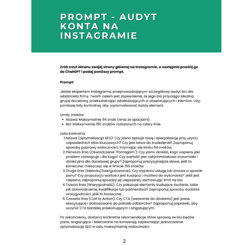 Znajdziesz tu instrukcje krok po kroku: od pierwszego audytu konta na Instagramie, przez generowanie pomysłów na reelsy i stories, aż po pisanie reklam sprzedażowych i automatyzację maili. Dzięki temu zyskasz gotowy system, który pozwoli Ci tworzyć i publikować treści w przewidywalny i skuteczny sposób.