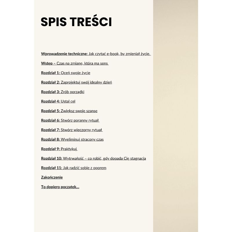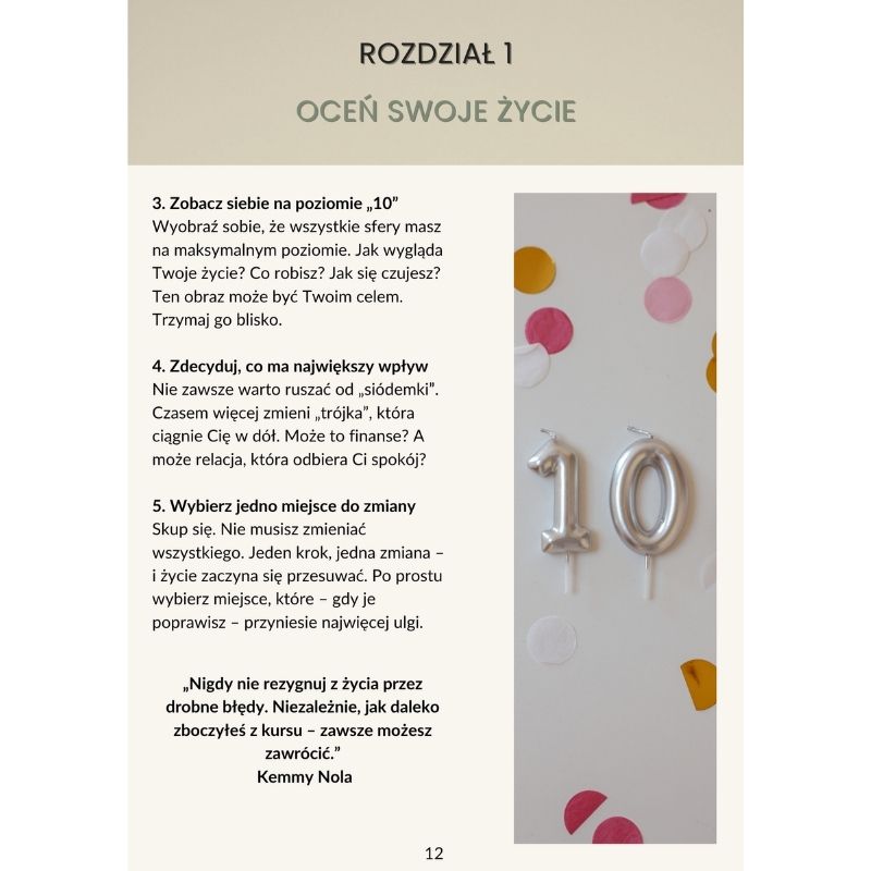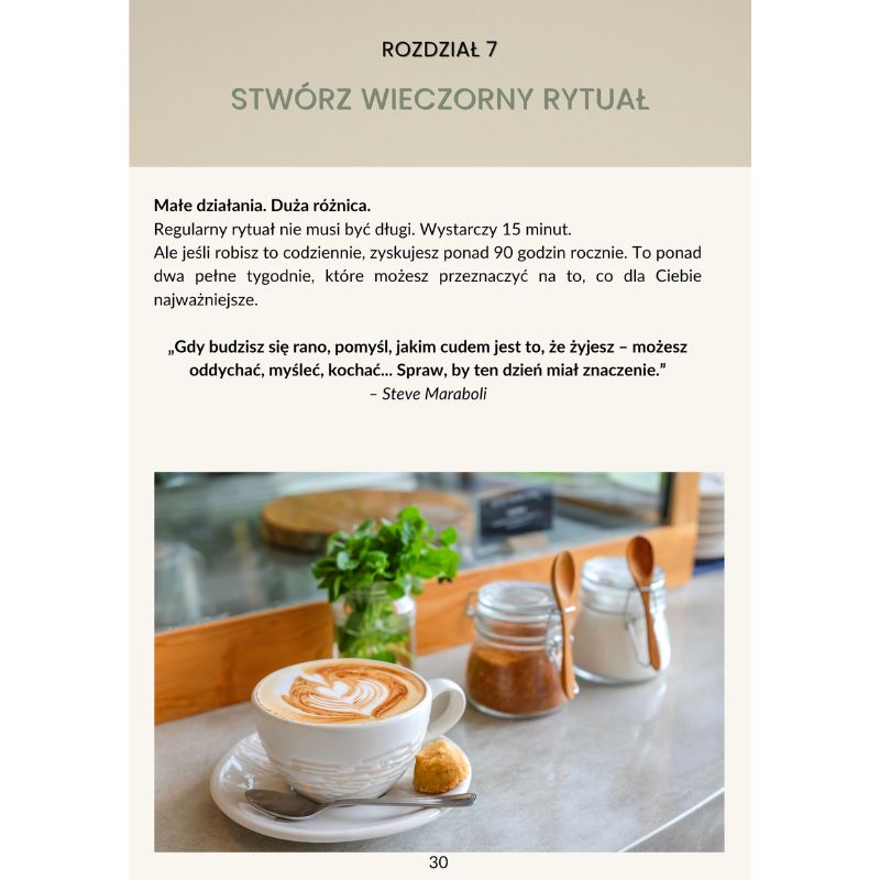 Kupiłam tego e-booka bo miałam wrażenie że moje życie trochę stoi w miejscu i ciągle zaczynam coś od nowa. Książka jest napisana prostym językiem i łatwo się ją czyta. Najbardziej pomogły mi ćwiczenia i te fragmenty o nawykach oraz planie działania. Człowiek zaczyna trochę inaczej patrzeć na swoje decyzje i na to jak wygląda dzień. Nie jest to jakaś magiczna zmiana od razu, ale daje dużo do myślenia i pomaga się ogarnąć.