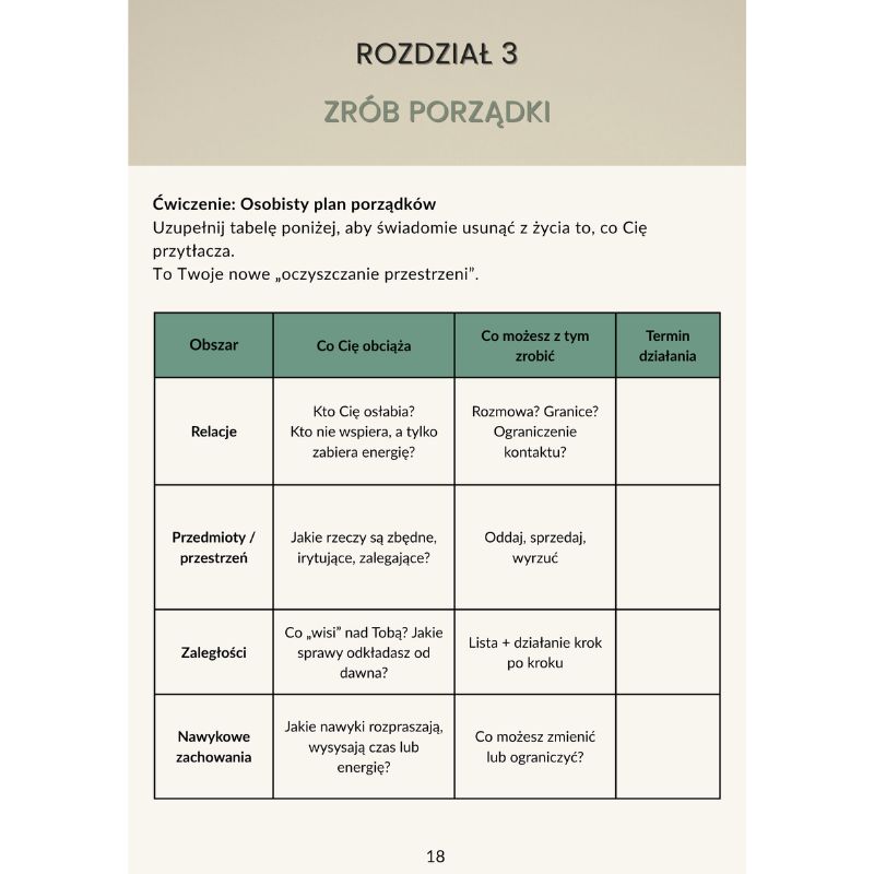 konkretne ćwiczenia i tabele, które pomagają się zatrzymać i naprawdę przemyśleć swoją sytuację. Najbardziej pomogła mi część o zarządzaniu czasem i energią.